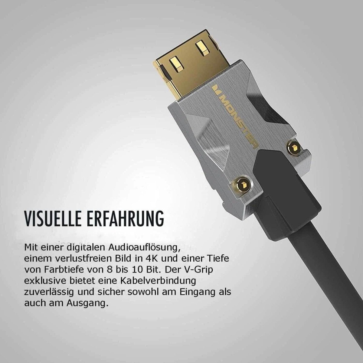 The patented Monster V-Grip™ connector anchors itself firmly in the HDMI socket. This prevents signal interruptions due to accidental loosening of the cable.