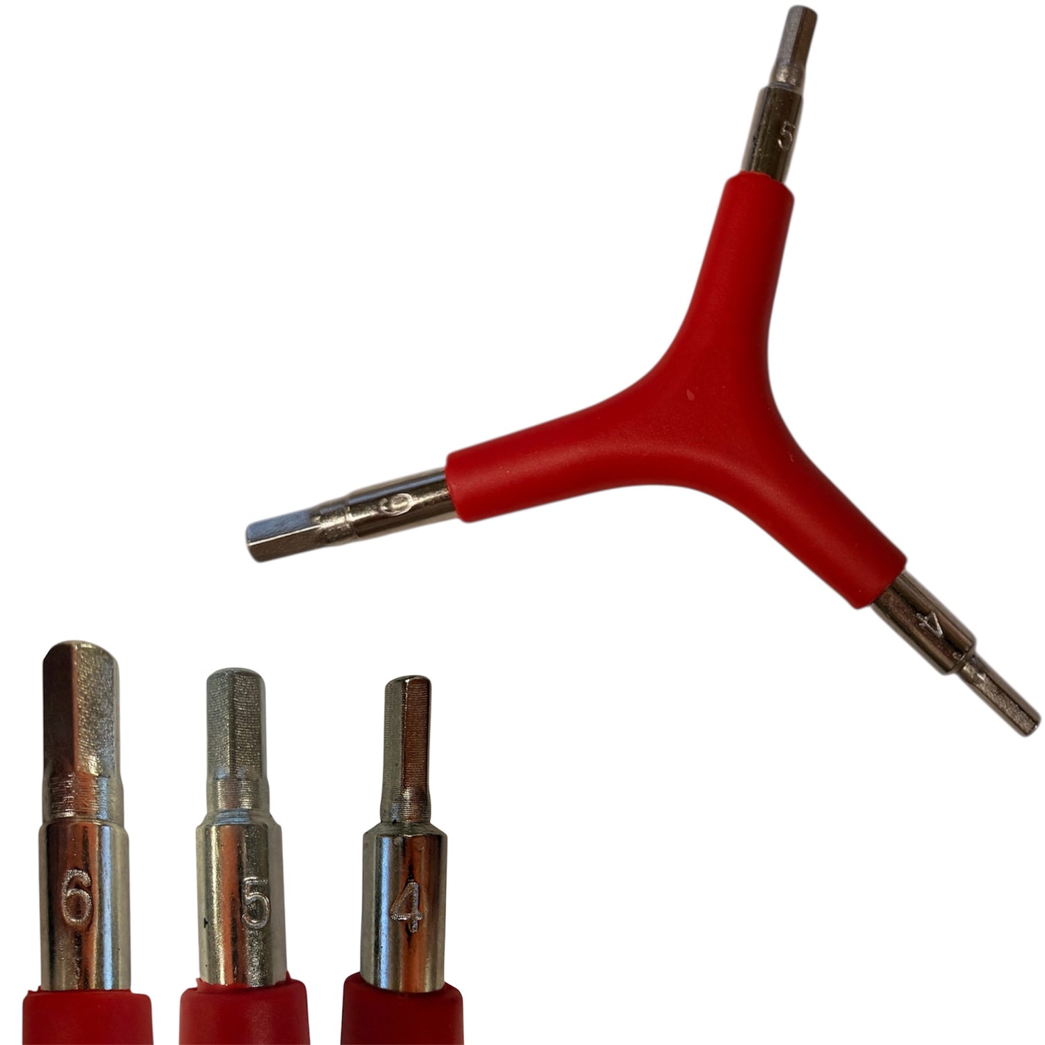 Y-tööriist ühendab endas kolme kõige levinumat metrilist kuuskantpesa suurust: 4 mm, 5 mm ja 6 mm. Need on selgelt märgitud tööriista vastavatesse otstesse.
